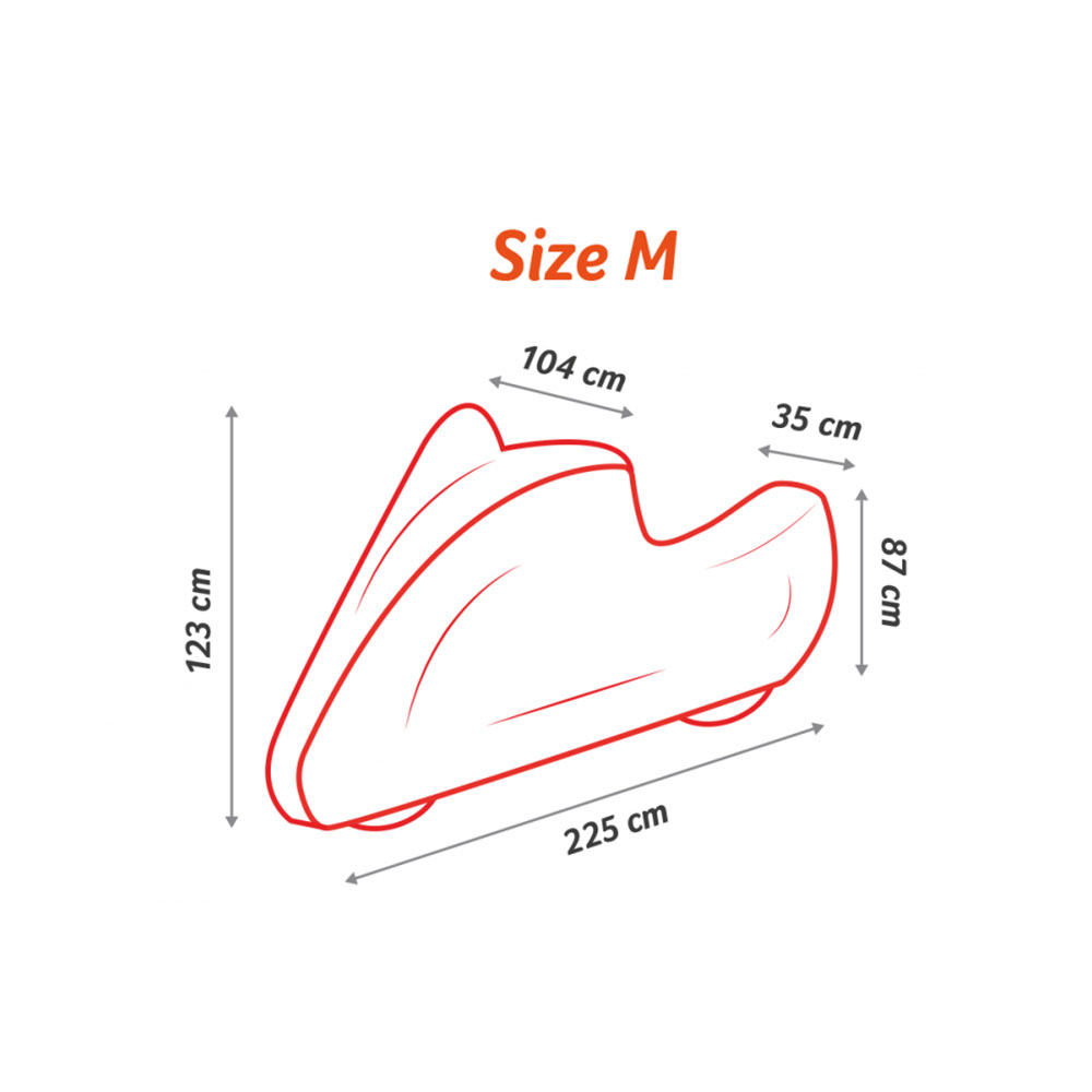 Lungime 'M' 225 cm, inaltime fata 123 cm, latime volan 104 cm, latime spate 35 cm, inaltime spate 87 cm.