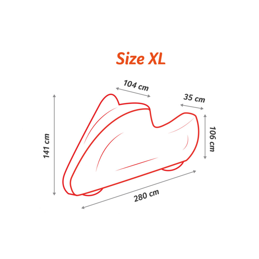 Lungime 'XL' 280 cm, inaltime fata 141 cm, latime volan 104 cm, latime spate 35 cm, inaltime spate 93 cm.