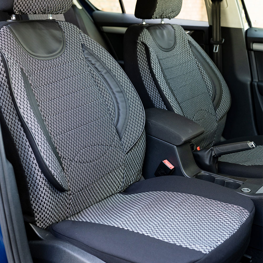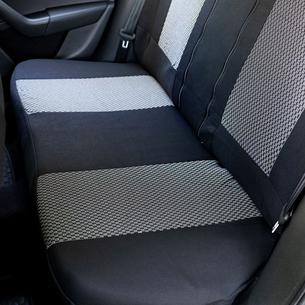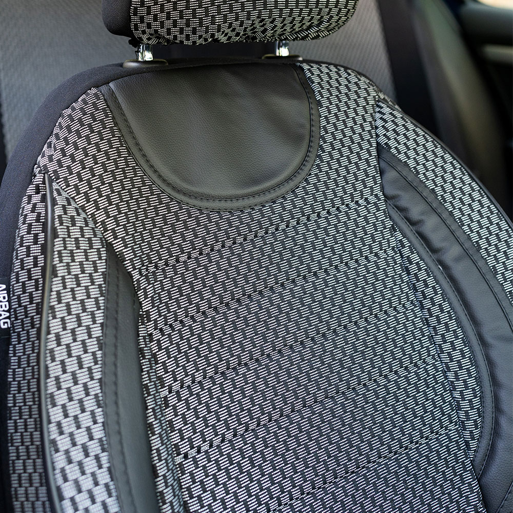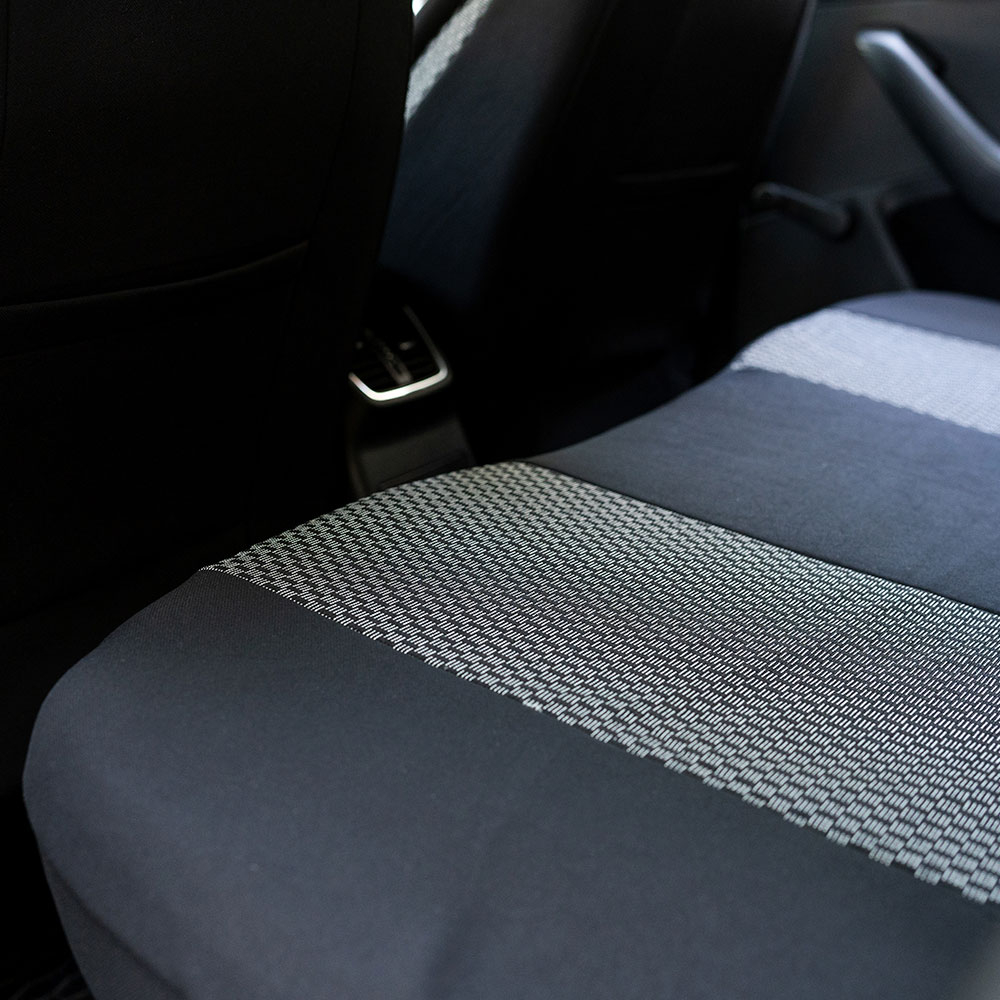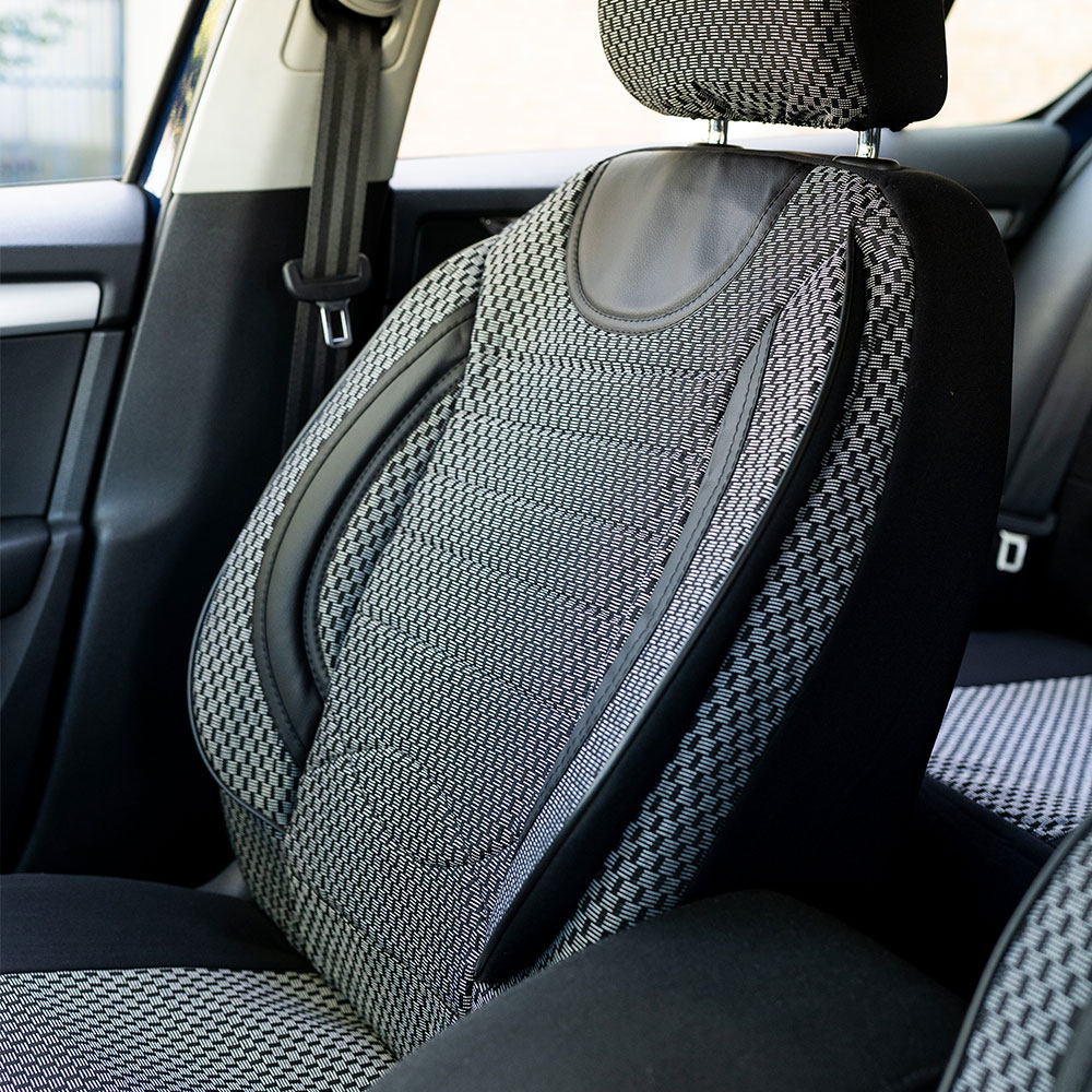 Huse din material textil dublu laminat similar cu tapiteriile originale, cu insertii de piele ecologica si ambele fete dublate cu burete (grosime 5mm)