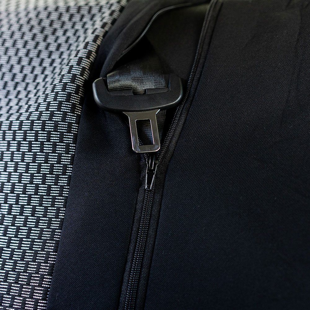Husa bancheta spate este prevazuta cu 2 fermoare, care faciliteaza accesul la cotiera si rabatarea banchetei (1/3 sau 2/3 din latime)