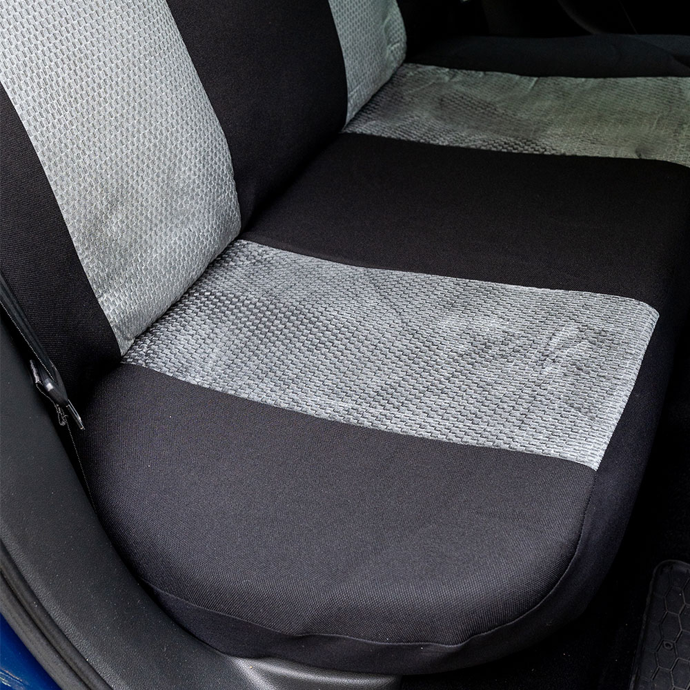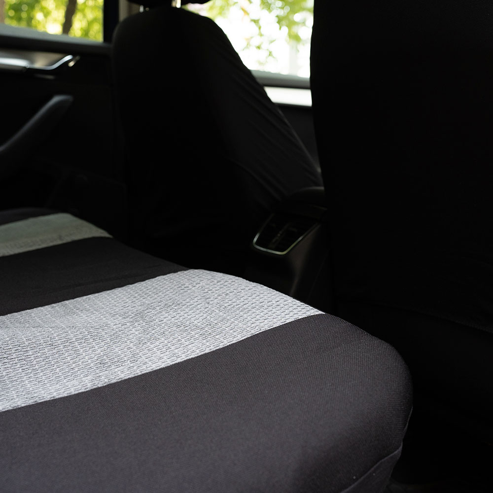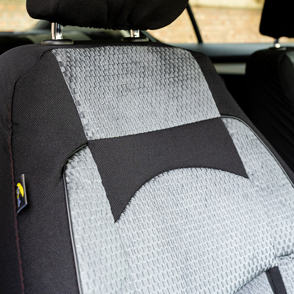 Huse din material textil dublu laminat similar cu tapiteriile originale, cu insertii de piele ecologica si ambele fete dublate cu burete (grosime 5mm)