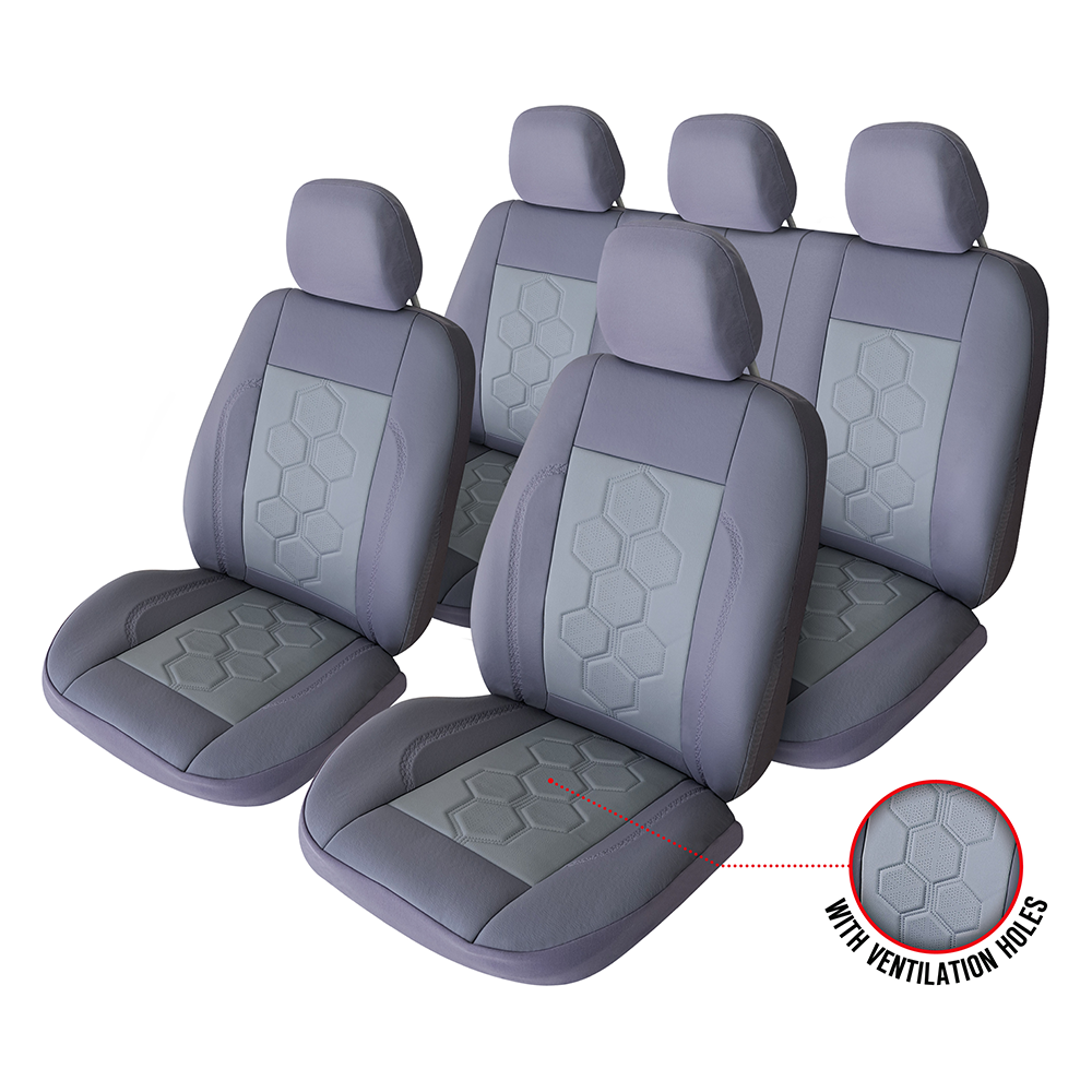 Huse din piele neteda, cu insertii de piele perforata similara cu tapiteriile originale, cu ambele fete dublate cu burete ce confera protectie lombara (grosime 8/25 mm)