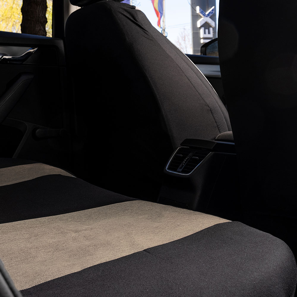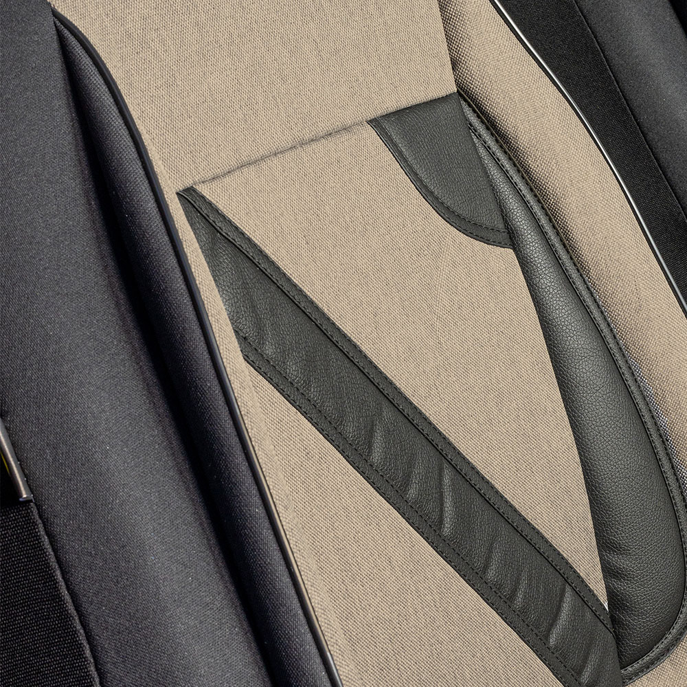 Huse din material textil dublu laminat similar cu tapiteriile originale, cu insertii de piele ecologica si ambele fete dublate cu burete (grosime 5mm)