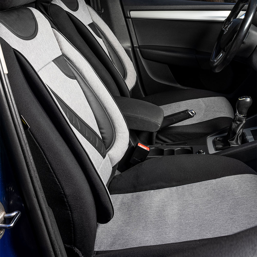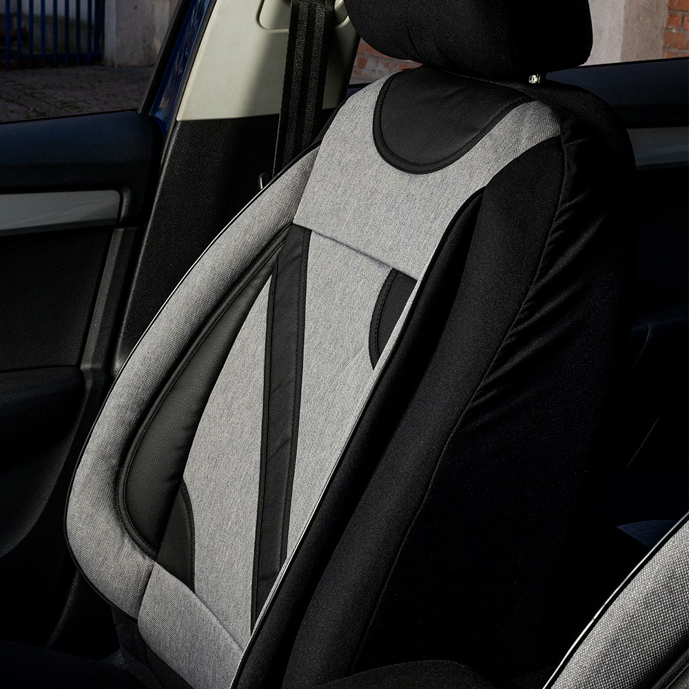 Huse din material textil dublu laminat similar cu tapiteriile originale, cu insertii de piele ecologica si ambele fete dublate cu burete (grosime 5mm)