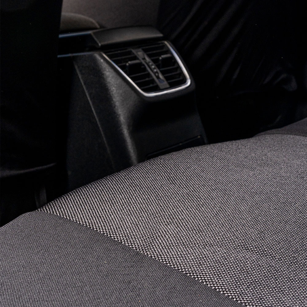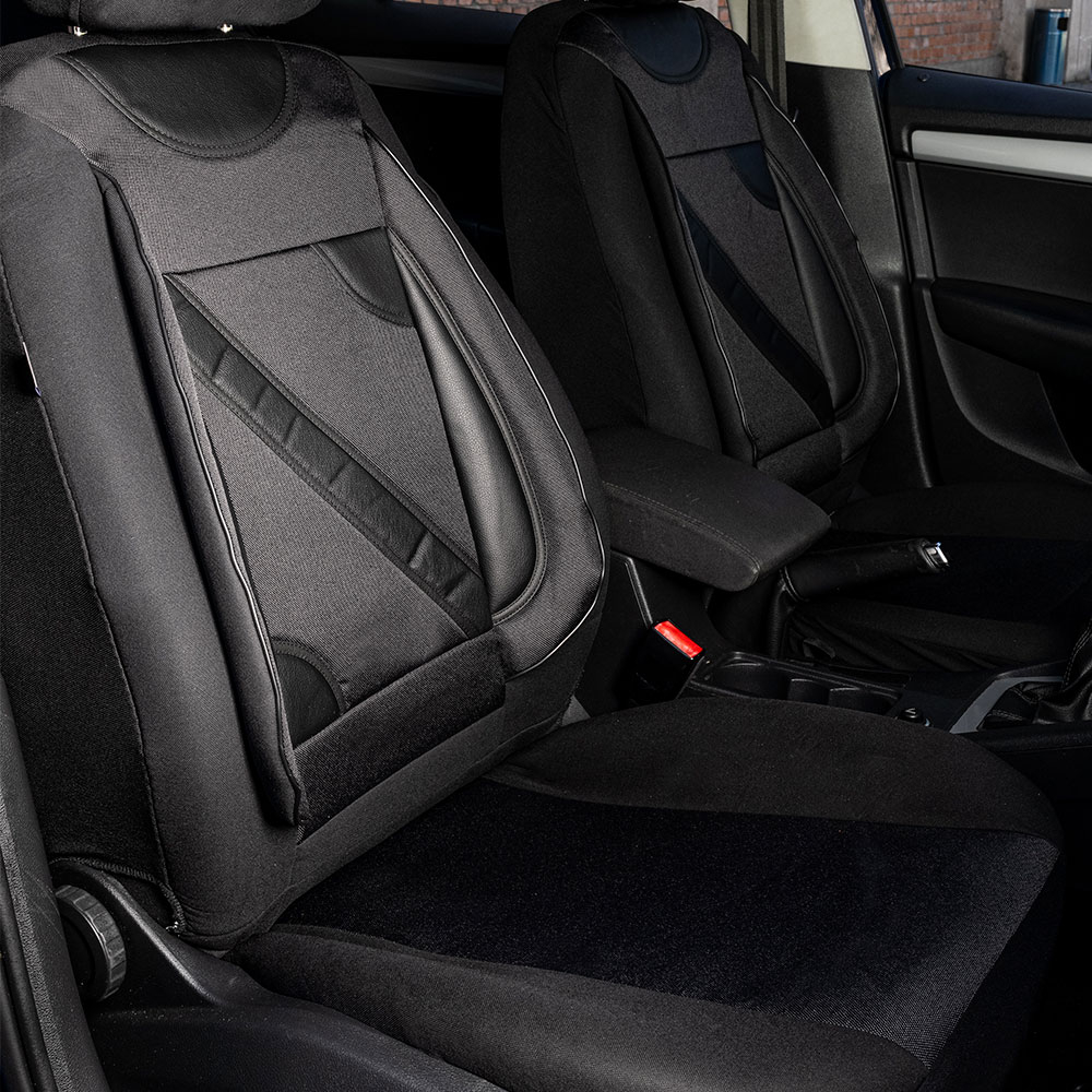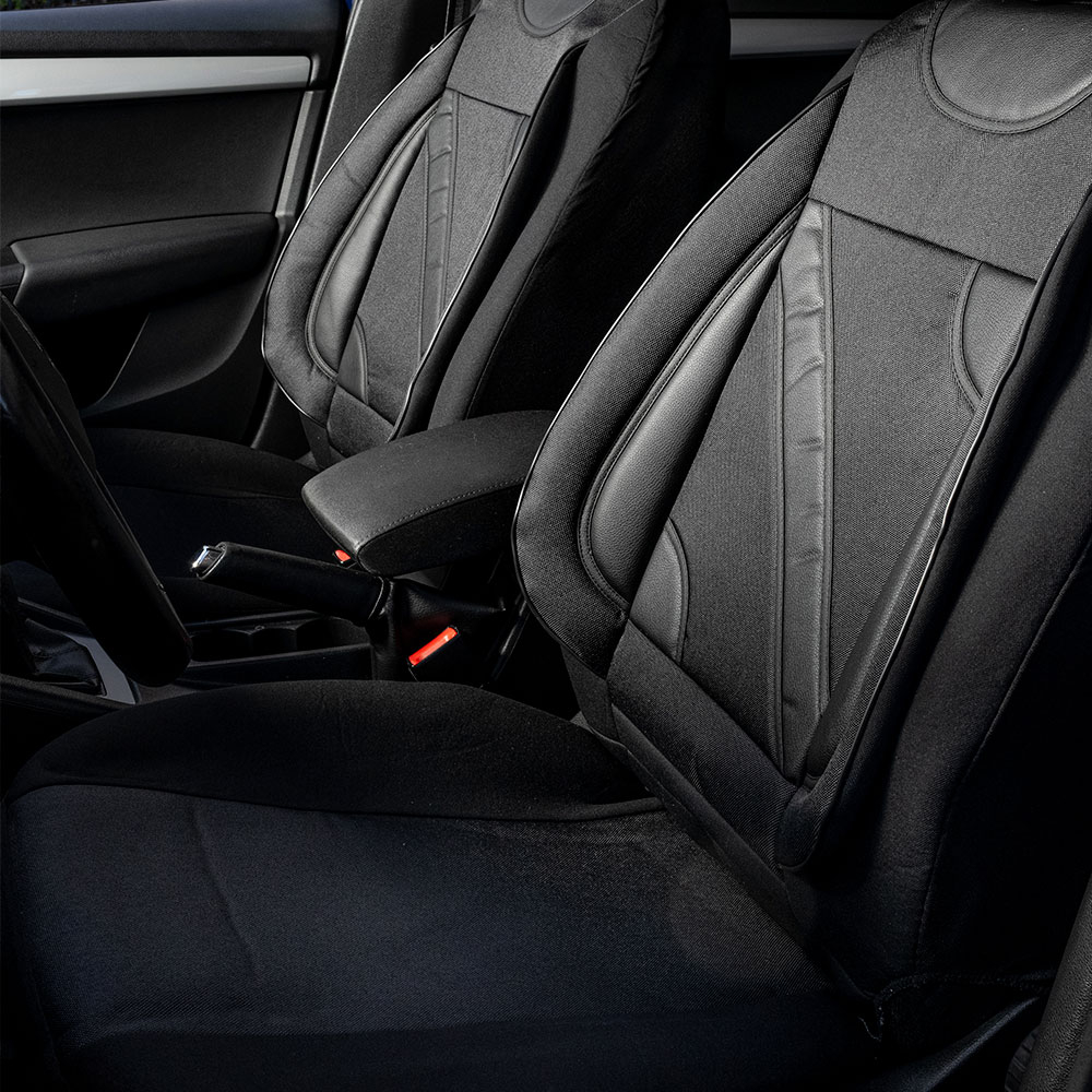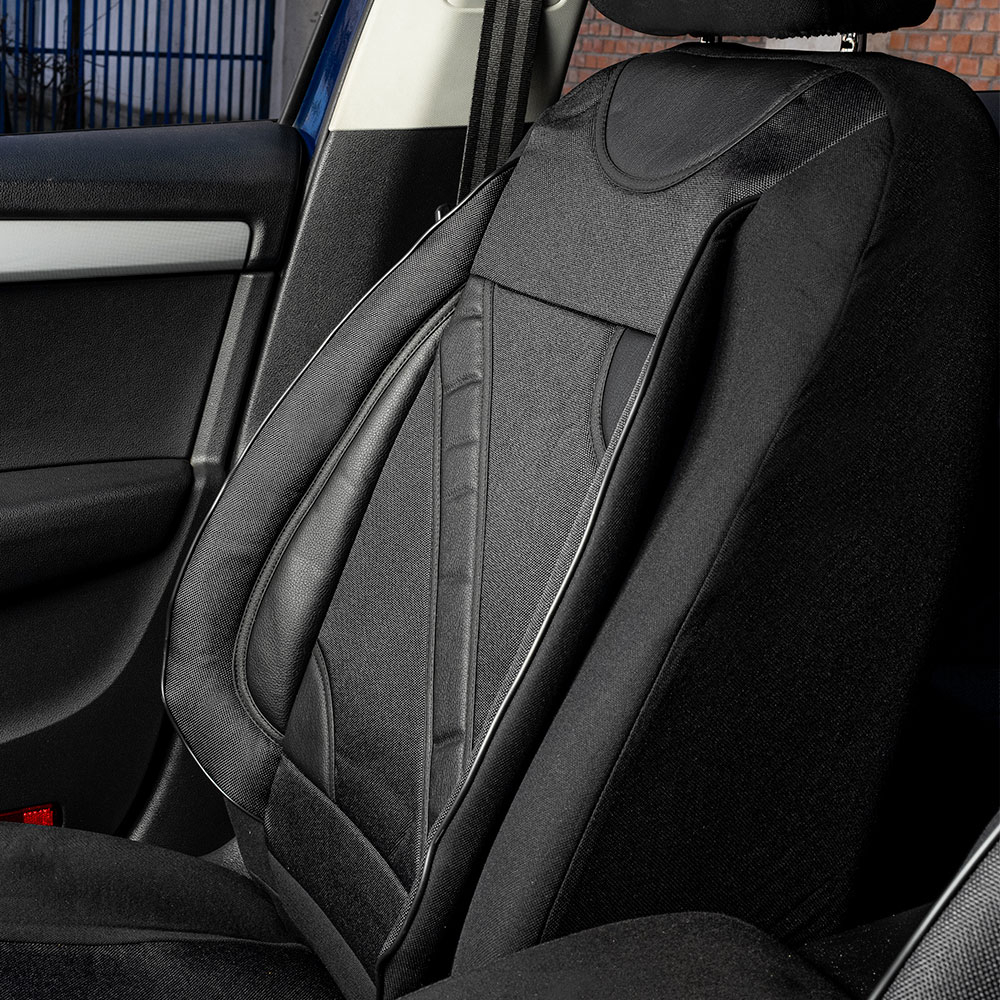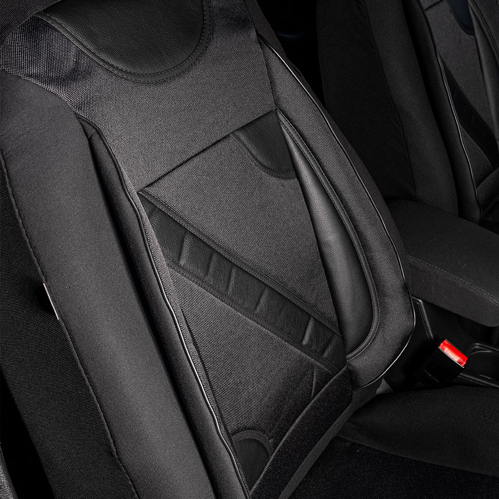 Huse din material textil dublu laminat similar cu tapiteriile originale, cu insertii de piele ecologica si ambele fete dublate cu burete (grosime 5mm)