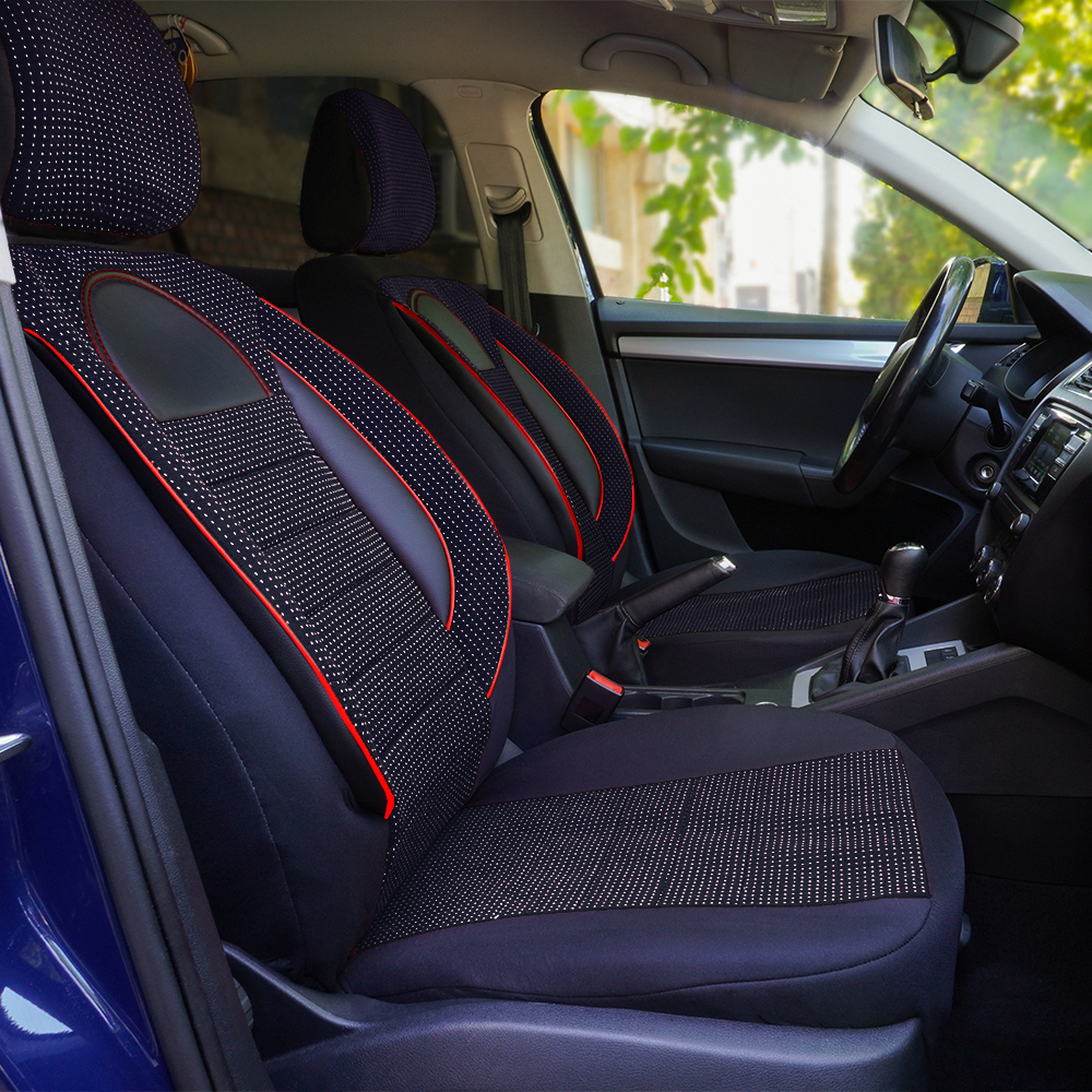 Huse din material textil dublu laminat similar cu tapiteriile originale, cu insertii de piele ecologica si ambele fete dublate cu burete (grosime 5mm)