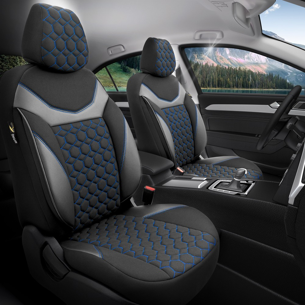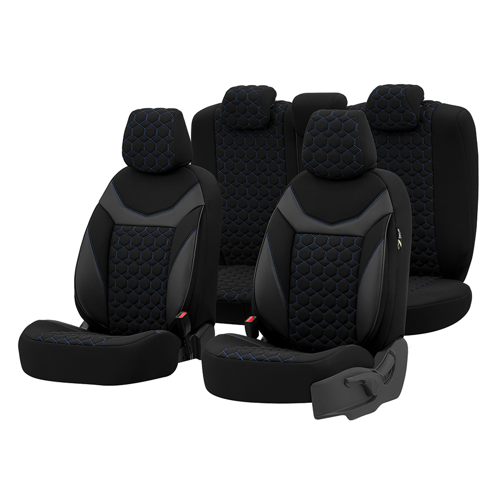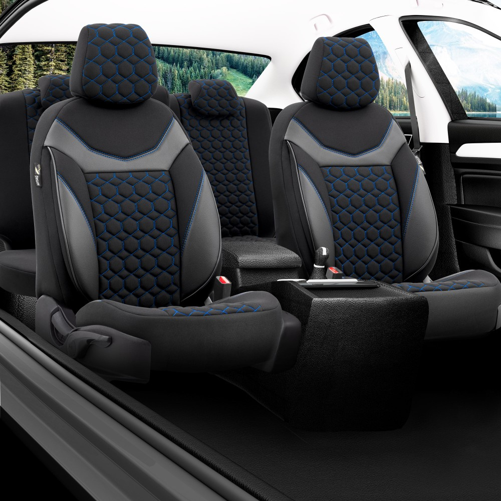 Huse din material textil dublu laminat similar cu tapiteriile originale (OEM), cu insertii de piele ecologica si ambele fete dublate cu burete (5mm grosime)