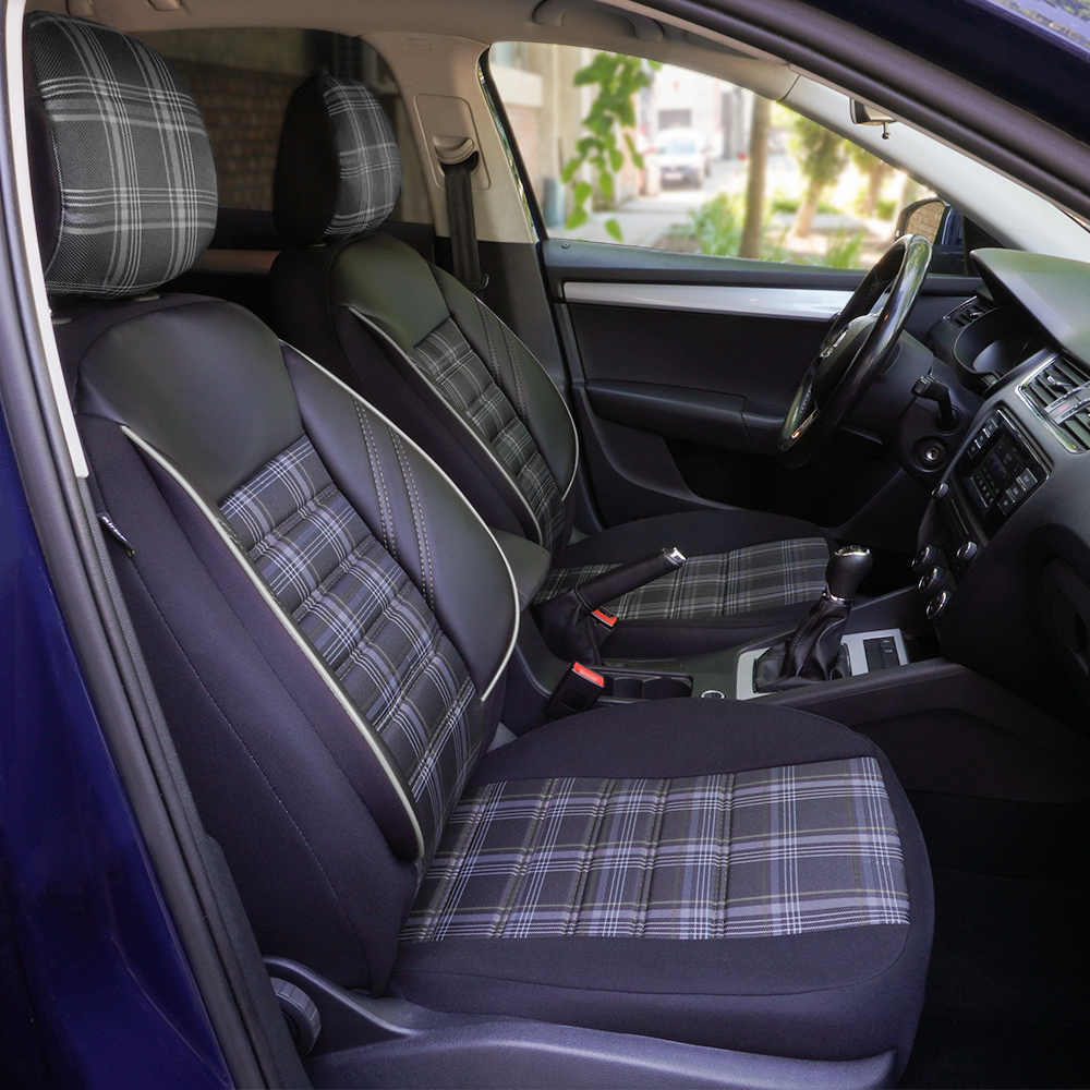 Huse din material textil dublu laminat similar cu tapiteriile originale (OEM), cu insertii de piele ecologica si ambele fete dublate cu burete (5mm grosime)