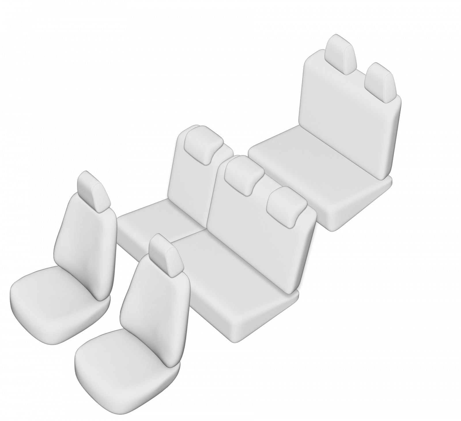 Modelul este compatibil 100% cu scaunul auto original, iar designul este similar cu acesta, asigurand functionalitatea dotarilor existente: randul 1 spate cu spatar si sezut bancheta fractionate (2+1), randul 2 spate cu spatar fractionat (1+1), centuri, manere de rabatare, gauri tetiere, etc. Tetiera in forma de L la randul 1 spate.
