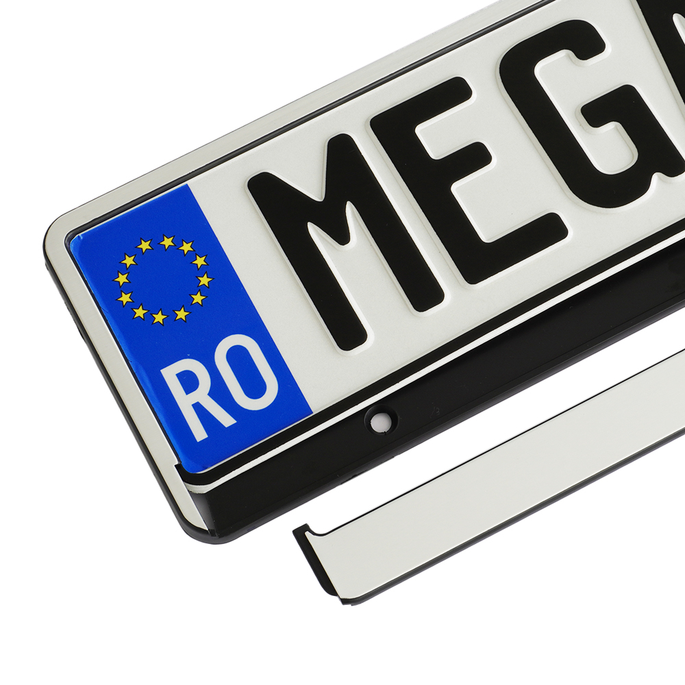 Suport chrome cu rigleta detasabila pentru fixarea placutelor de inmatriculare auto. Realizata in intregime din polipropilena.