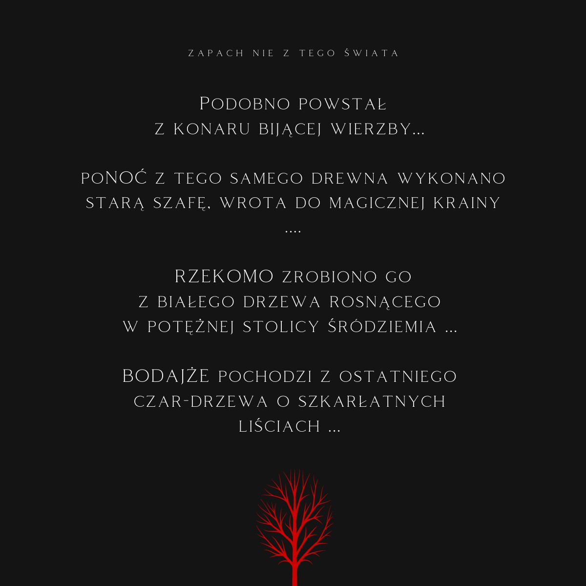 Se presupune că a fost făcută din crenga unei sălcii... Se presupune că o garderobă veche, o poartă către un tărâm magic, a fost făcută din același lemn... Se presupune că a fost făcut dintr-un copac alb care creștea în puterea mare. capitala Pământului de Mijloc... Poate că provine de la ultimul copac magic cu frunze stacojii... Cert este însă că miroase din lumea asta.