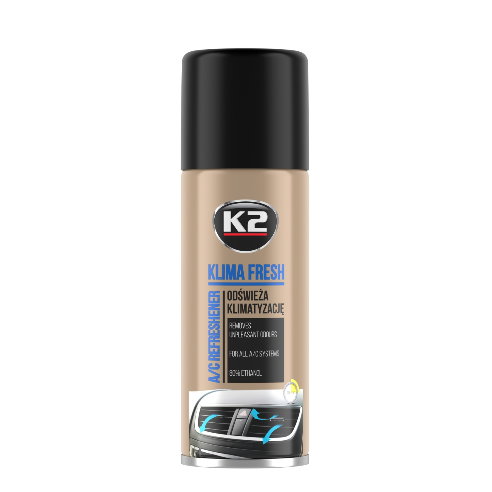 Odorizantul pentru aer condiționat K2 KLIMA FRESH este un agent extrem de eficient și ușor de utilizat pentru împrospătarea aerului condiționat. Îndepărtează mirosurile neplăcute cauzate de murdărie și umiditate din sistemul de ventilație. Întregul proces nu durează mai mult de o duzină de minute. Potrivit pentru toate tipurile de aer condiționat. După utilizare, lasă un miros proaspăt. MOD DE UTILIZARE: Închideți toate ușile și ferestrele. Setați fluxul de aer la putere maximă, recirculare la circuit închis, aer condiționat la rece. Deplasați scaunul șoferului cât mai departe posibil și rabatați spătarul în jos. Agitați preparatul și lăsați-l în spatele scaunului șoferului. Apăsați butonul de pulverizare până se blochează. Ieși din mașină. După aproximativ 10 minute, împrospătarea ar trebui să se încheie. Poți intra în mașină. Aruncați containerul uzat și ventilați mașina înainte de a conduce. Setați recirculația la circulație deschisă. UTILIZAREA CORECTĂ A AERULUI CONDIȚIONAT Un sistem eficient de aer condiționat are un efect pozitiv asupra confortului și crește siguranța la conducere. S-a constatat că conducerea îndelungată într-o mașină supraîncălzită poate duce la un accident. Pentru o funcționare eficientă, se recomandă reîmprospătarea regulată a sistemului de aer condiționat și înlocuirea filtrului de habitaclu o dată pe an sau la fiecare 15.000 km. km. Mirosurile neplăcute provin din aer condiționat din cauza ciupercilor care cresc acolo, care pot provoca alergii. Aerul conditionat trebuie folosit tot timpul anului, cand aerul conditionat este pornit, usuca perfect aerul si protejeaza astfel geamurile impotriva aburirii. Folosirea aerului condiționat în timpul iernii asigură o lubrifiere adecvată a componentelor sistemului. Vara, pentru a răci rapid interiorul încălzit al mașinii, deschideți mai întâi geamurile și ventilați mașina și abia apoi porniți aerul condiționat. Dacă este posibil, parcați la umbră. După oprirea aerului condiționat, ventilatorul ar trebui să continue să sufle aer pentru o perioadă. Se recomandă utilizarea cu înțelepciune a aerului condiționat, setând temperatura nu mai mică de +21 C și diferența de temperatură nu mai mare de 7 ° C în raport cu temperatura ambiantă. Astfel, după părăsirea mașinii, nu suntem expuși unui salt prea mare de temperatură și riscului de a răci. Utilizarea aerului condiționat crește consumul de combustibil cu aproximativ 0,5 l/100 km.