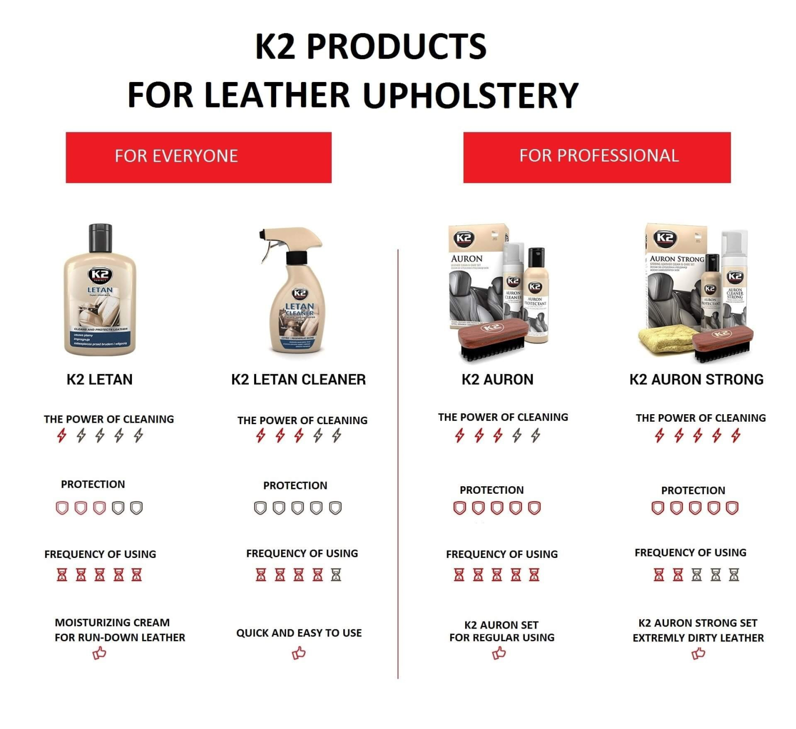 K2 Letan Cleaner este un agent eficient și ușor de utilizat pentru curățarea rapidă a pielii naturale și artificiale din interiorul mașinii.