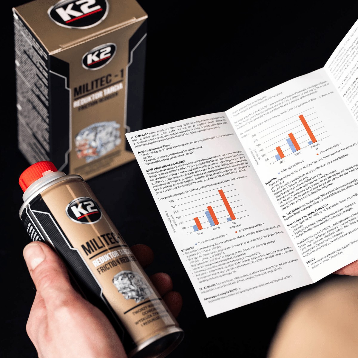 Militec-1 este un aditiv de ulei 100% sintetic produs pe baza celei mai avansate tehnologii de nanoparticule. Ingredientele active ale produsului acționează direct asupra pieselor metalice, creând legături la nivel molecular și pătrund în spațiul intergranular al straturilor de suprafață ale elementelor de frecare. Ca rezultat al reacției de mai sus, pe elementele cooperante se creează un strat protector foarte subțire și extrem de durabil. Militec-1 nu conține elemente solide potențial dăunătoare și nu modifică proprietățile elastice ale metalului. Contribuie la o extindere semnificativă a durabilității mecanismelor. Militec-1 este miscibil cu toate uleiurile de motor, transmisii și uleiuri hidraulice, indiferent de vâscozitatea și clasa lor de calitate. Odată ce Militec-1 este adăugat la motor, acesta rămâne în interior mai mult timp, protejând astfel motorul în ciuda schimburilor regulate de ulei conform manualului de utilizare al mașinii. Poate fi folosit la motoarele cu ambreiaj umed.