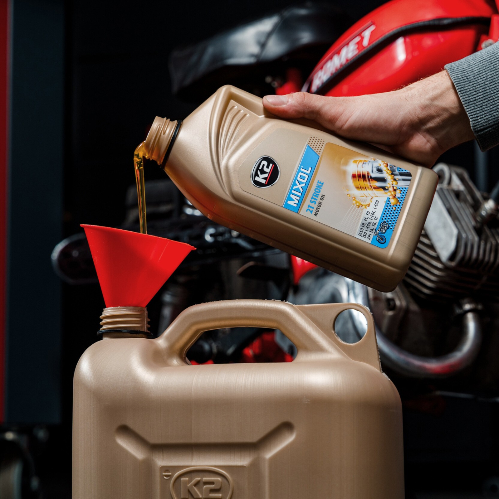 Uleiul pentru amestecarea în motoarele în doi timpi, răcit cu aer și apă, protejează motorul împotriva uzurii și reduce formarea depunerilor și depunerilor de carbon. Aditivii lubrifianti si anticorozivi selectati in proportii optime reduc fumul. După amestecare, se creează un amestec omogen care facilitează pornirea în toate condițiile. O soluție ideală pentru proprietarii de motociclete emblematice din vremurile Republicii Populare Polone Cum se utilizează: Pregătiți amestecul conform recomandărilor producătorului de motoare, de obicei 1:50.