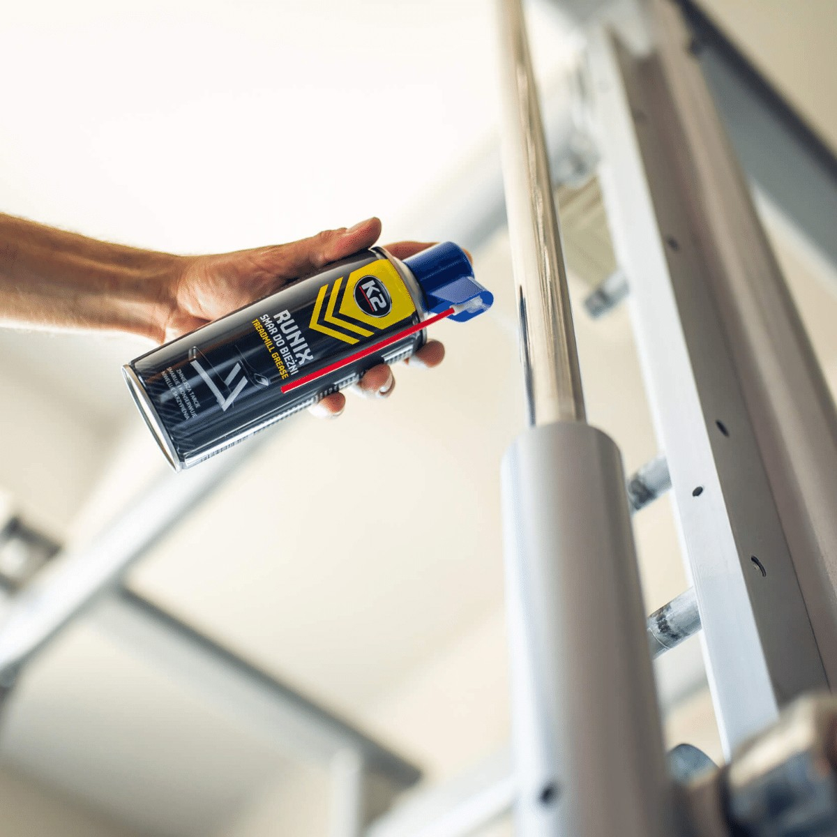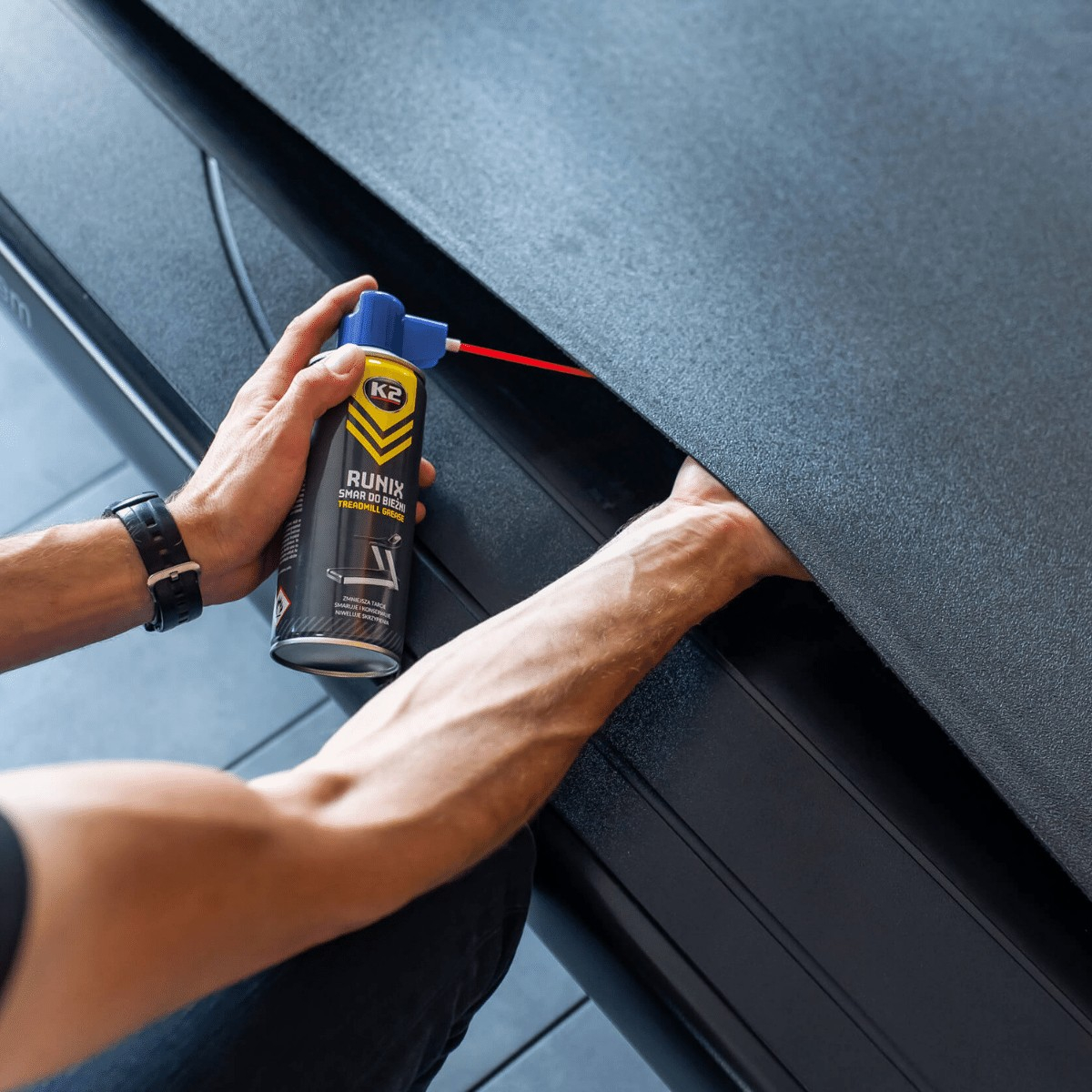 Lubrifiați în conformitate cu instrucțiunile dispozitivului. Agitați înainte de utilizare. Aplicați în jet subțire de la o distanță de 20 ÷ 30 cm între centură și masa benzii de alergare. Suprafața dintre centură și blat trebuie să fie curată și uscată. Ștergeți excesul cu o cârpă uscată. Repetați operațiunea dacă este necesar.